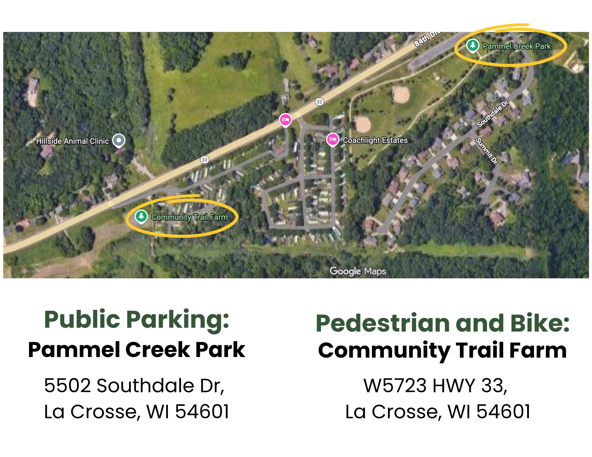 The Community Trail Farm is located at W5723 HWY 33, La Crosse, WI, 54601.